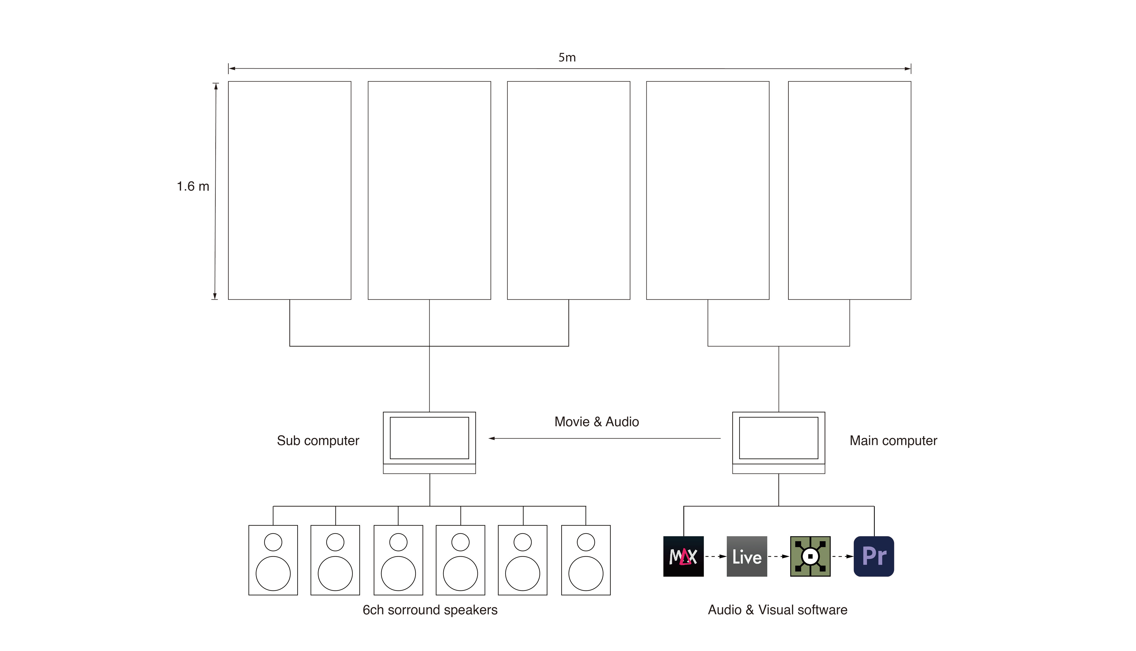 TouchDesigner ではその音の変化をトリガーに映像を生成し、二台のPCで五面ディスプレイを同期させて空間へ展開した。